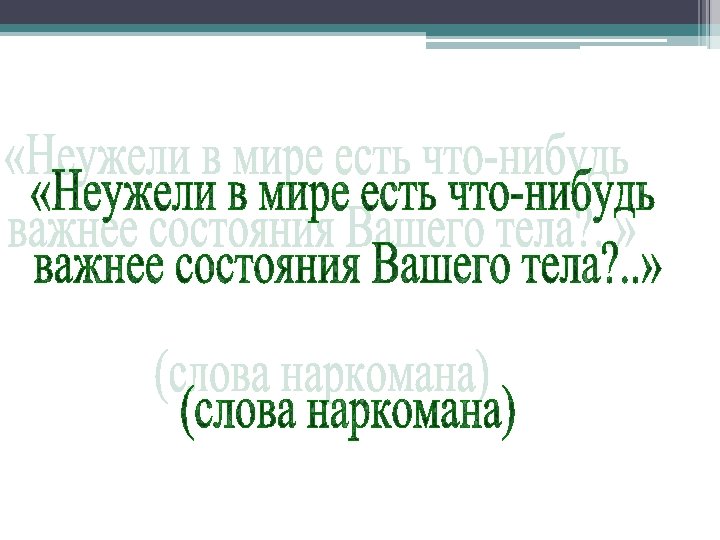 Статистика наркозависимых • В России официально зарегистрировано 503 тысяч человек, состоящих на учете в наркодиспансерах • Реальное количество страдающих от наркотической зависимости 5, 99 млн человек • При этом 80 граждан РФ умирают ежедневно • В 2006 году от наркомании умерло около 100 тыс. человек. • В 2007 погибло 70 тысяч наркоманов • От общего числа наркоманов в России по статистике 20% - это школьники. 60% – молодежь в возрасте 16 -30 лет 20% - люди более старшего возраста