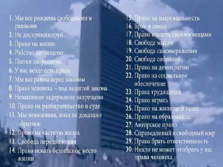 День прав человека В 1950 году в честь Декларации, ООН учредила праздник День прав человека, отмечаемый 10 декабря. В праздновании принимают участия люди, различные сообщества и религиозные группы, парламенты, правительства и, разумеется, сама Организация Объединенных Наций. Каждые десять лет предпринимаются кампании по продвижению Декларации и непосредственно прав человека. 10 декабря 2007 года стартовала кампания под названием «Человеческое достоинство и справедливость для всех нас» , в которой приняли активное участие все страны-члены ООН, которая продлилась ровно год, до 60 -ой годовщины.