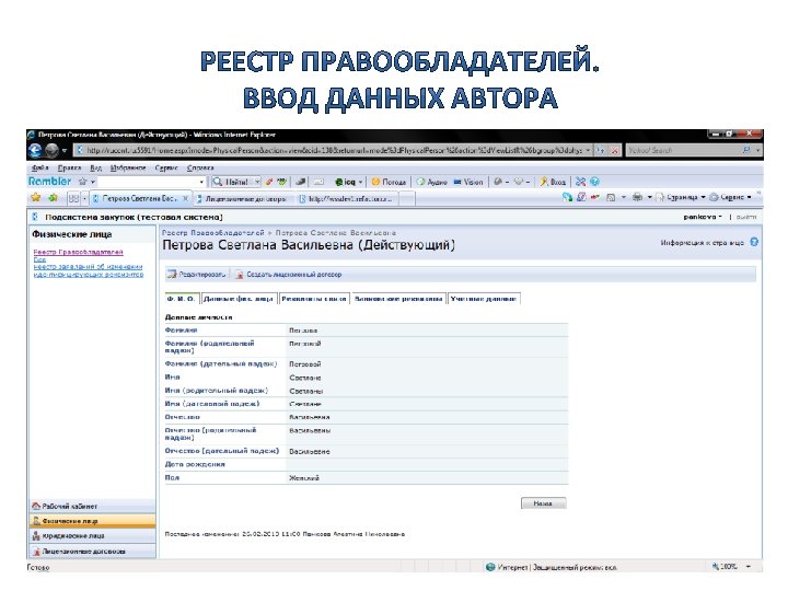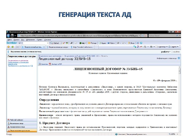 Информационная технология ПОДСИСТЕМА «ПОЛНОМОЧНЫЙ ПРЕДСТАВИТЕЛЬ» 1. Агентско–сетевая группа. 1. 1. А-Менеджер (A-Manager) 1. 2. Старший А-Менеджер (Senior A-Manager). 1. 3. С-менеджер (C-Manager) 1. 4. Полномочный представитель (Agent) ПОДСИСТЕМА «ЛИЦЕНЗИОННЫЙ ДОГОВОР» 1. Книжные издания. 1. 1. Многотомные и продолжающиеся издания 1. 2. Однотомные издания 2. Периодические издания. 2. Информационно–Пользовательская группа. 2. 1. М-менеджер (M-Manager) 2. 2. Правообладатель 2. 3. Внешний пользователь (External User) 2. 4. Демо-пользователь ИС (Demo User) 2. 5. Клиент (Client) 2. 6. Директор (Director) 2. 1. Архив периодических изданий 2. 2. Подписка 3. Аудио произведения. 3. 1. Аудио-книги и аудио-спектакли 3. 2. Музыкальные произведения и их сборники 4. Аудиовизуальные произведения. 4. 1. Видеофильмы 4. 2. Видеоклипы и их сборники 5. Мультимедийные произведения. 5. 1. Компьютерные игры и их сборники 5. 2. Обучающие курсы 6. Программное обеспечение. 6. 1. Базы данных 6. 2. Информационно-справочные системы 6. 3. Программы для ЭВМ и их сборники 7. Электронные библиотеки полнотекстовых документов. ПОДСИСТЕМА «КОНТЕНТ МЕНЕДЖМЕНТ» 1. Информационно–производственная группа. 1. 1. Контент-партнер (Partner) 1. 2. Старший контролер ЭПД (Senior Content Controller) 1. 3. Контролер ЭПД. (Content Controller) 1. 4. Зав. канцелярией (Authorized Secretary) 1. 5. Секретарь (Secretary) 2 Информационно – технологическая группа. 2. 1. Администратор БМ (Content administrator) 2. 2. Администратор (Administrator) 2. 3. Разработчик. (Developers)