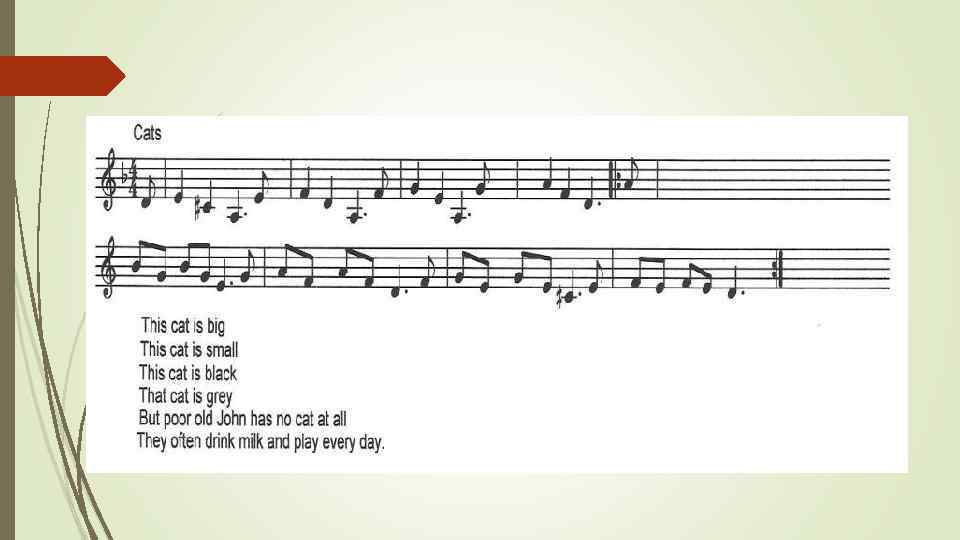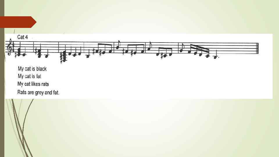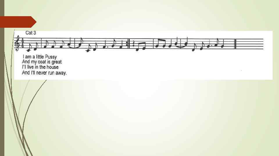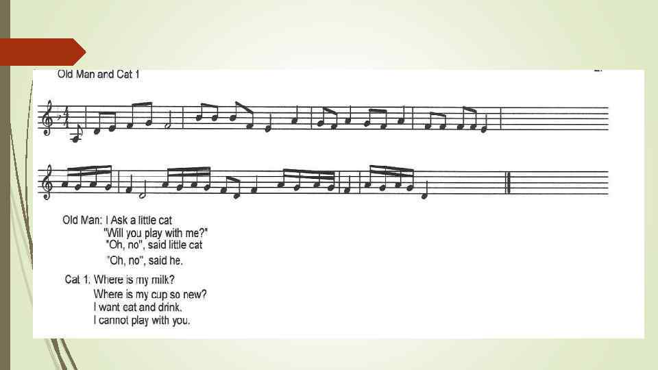 Scene 7 OLD MAN (sings): I ask a little cat ‘Will you play with me? ’ ‘Oh, no’, said little cat. Oh, no”, said he. CAT 1 (sings): Where is my milk? Where is my cup, so new? I want to eat and drink. I cannot play with you.