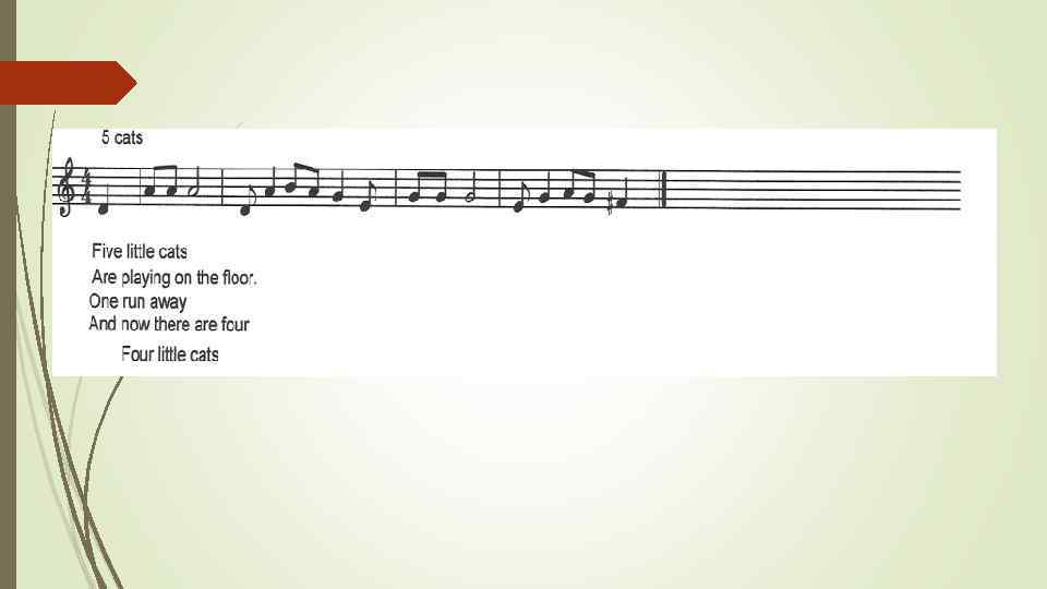 Scene 6 5 cats (dance and sing): Five little cats are Are playing on the floor One runs away And now there are four Four little cats are Are playing on the floor All run away And now there are no