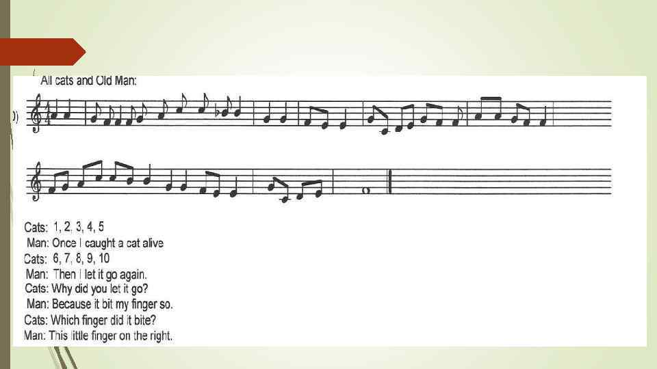 Scene 12 Cats and OLD MAN (go and sing): Cats : 1, 2, 3, 4, 5 OLD MAN: Once I caught a cat alive Cats: 6, 7, 8, 9, 10 OLD MAN: Then I let it go again. Cats: Why did you let it go? OLD MAN: Because it bit my finger so. Cats: Which finger did it bite? OLD MAN: This little finger on the right. Cats: 1, 2, 3, 4, 5, 6, 7, 8, 9, 10