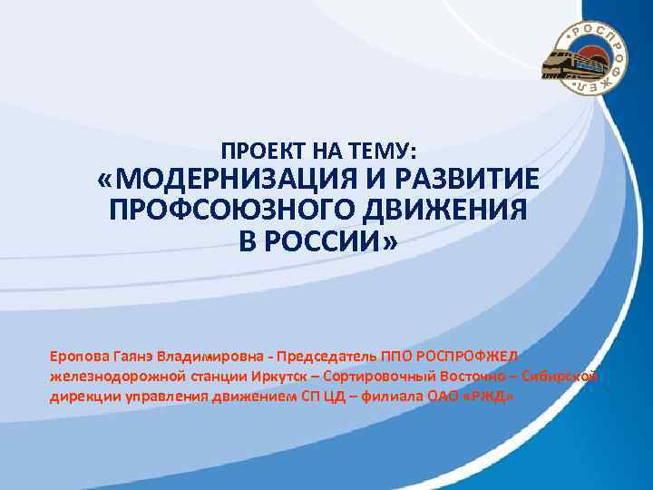 ПРОЕКТ НА ТЕМУ: «МОДЕРНИЗАЦИЯ И РАЗВИТИЕ ПРОФСОЮЗНОГО ДВИЖЕНИЯ В РОССИИ» Еропова Гаянэ Владимировна - Председатель ППО РОСПРОФЖЕЛ железнодорожной станции Иркутск – Сортировочный Восточно – Сибирской дирекции управления движением СП ЦД – филиала ОАО «РЖД»