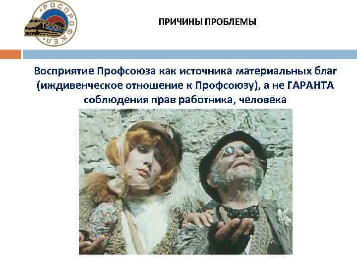 ПРИЧИНЫ ПРОБЛЕМЫ Восприятие Профсоюза как источника материальных благ (иждивенческое отношение к Профсоюзу), а не ГАРАНТА соблюдения прав работника, человека