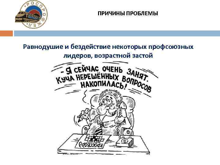 ПРИЧИНЫ ПРОБЛЕМЫ Равнодушие и бездействие некоторых профсоюзных лидеров, возрастной застой