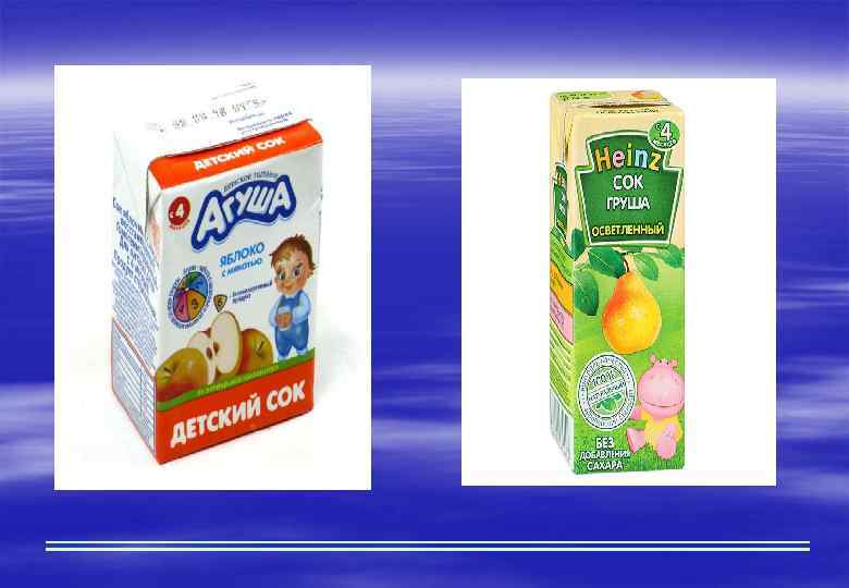 Фруктовый сок § Вводиться в рацион ребенка с 7 месяцев § Соки содержат органические кислоты (яблочную, лимонную и др. ), положительно влияющие на процессы пищеварения. § В соки промышленного производства могут быть добавлены витамин С, лимонная кислота, отдельные минеральные вещества, натуральные фруктовые ароматизаторы. § Первым рекомендуют назначать яблочный или грушевый соки, которые традиционны для россиян и реже вызывают аллергические реакции.