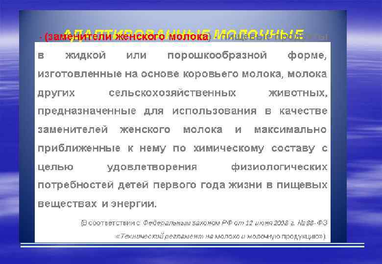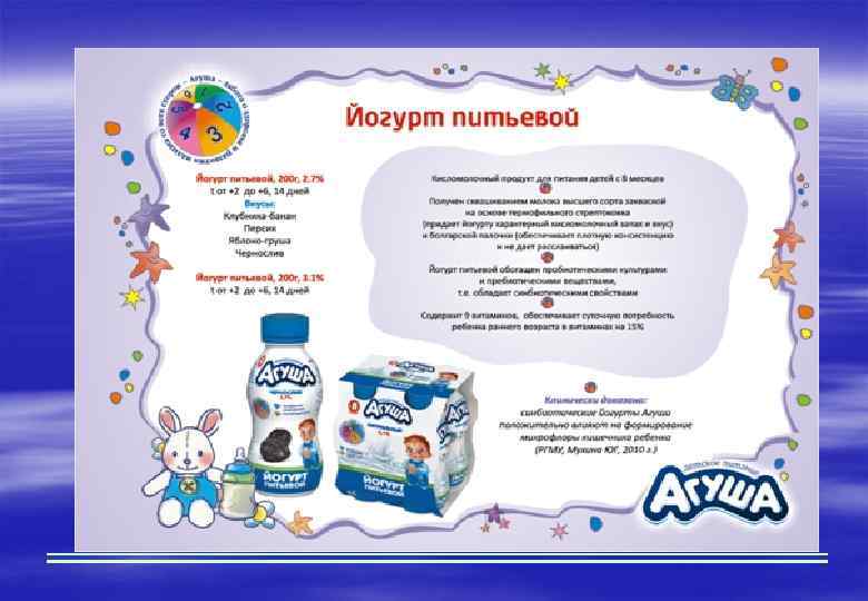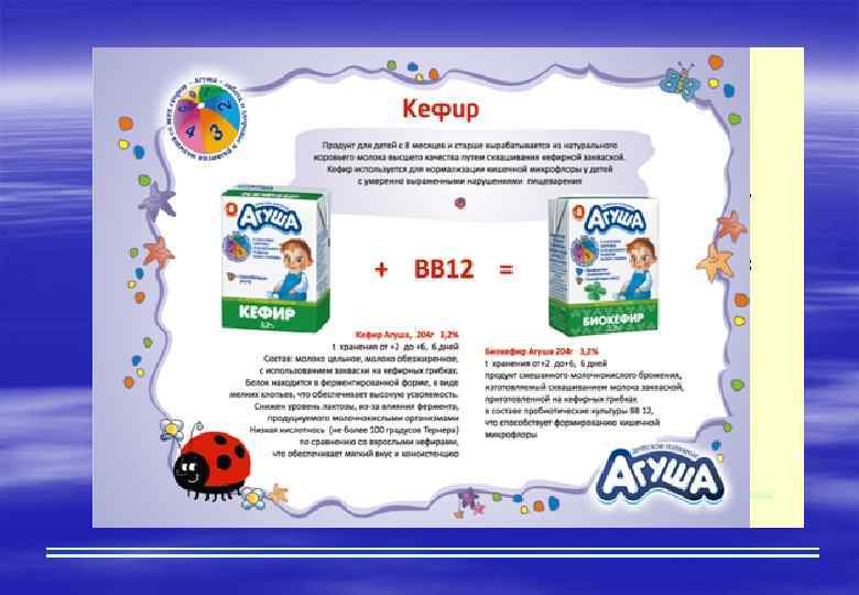 Кисломолочный прикорм § Кисломолочные продукты детского питания (детский кефир, бификефир, йогурт и др. ) в рацион ребёнка можно вводить с 8 -месячного возраста. § Кисломолочный прикорм (кефир и творог вводяться в рацион с 8 месяцев жизни ребенка). Кисломолочный прикорм вытесняет 1 грудное кормление.