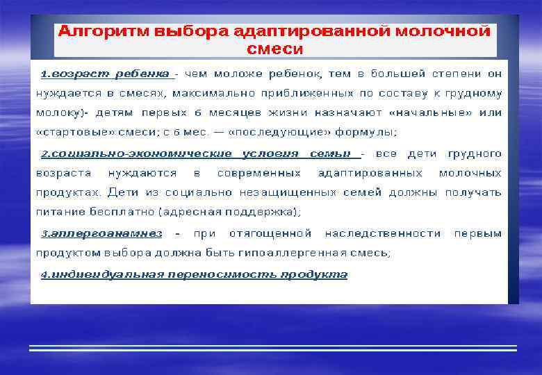 АЛГОРИТМ ГРУДНОГО ВСКАРМЛИВАНИЯ § подготовленные роды § раннее прикладывание к груди матери (в первые 30 минут) § совместное пребывание матери и ребенка в одной палате § свободное вскармливание § возможны интервалы между кормлениями 1 мес. 1, 5 часа, 2 мес. – 2 часа § обучение техники вскармливания § исключение средств, имитирующих грудь § установление индивидуальных режимов кормления к 1 -3 месяцам.