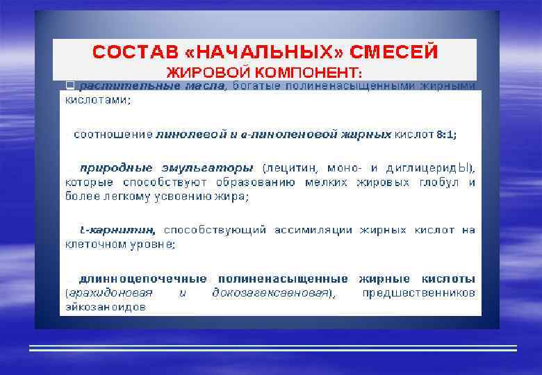 Состав грудного молока Жиры: Основными компонентами жира женского молока являются триглицериды, фосфолипиды, жирные кислоты, стеролы Наличие липазы: Высокая степень дисперсности. Преобладание ненасыщенных жирных кислот (олеиновая, арахидоновая, а-линоленовая): миелинизация нервных волокон, синтез простагландинов.