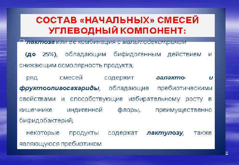 Состав грудного молока Углеводы: дисахарид -лактоза, олигосахариды и небольшое количеством глюкозы и галактозы - Лактоза (80 -90%): Активация бифидумфлоры. Подавление патогенной флоры. Способствует всасывание кальция. Олигосахариды (15%) (молозиво – 20 г/л, зрелое молоко- 13 г/л, в коровьем молоке < в 100 р. ): могут блокировать связывание специфических патогенов (ротавирусы, токсины E. coli, пневмококк и др. ) со структурами рецепторов на Олигосахариды поверхности клетки (конкуренция за рецепторы).