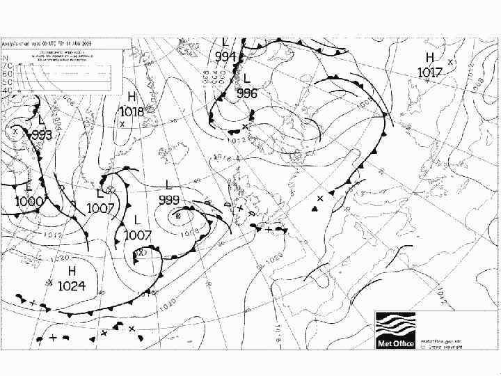 • На синоптических картах проводятся изобары, с помощью которых определяется положение циклонов (Н) и антициклонов (В); обозначаются линии раздела воздушных масс, то есть атмосферные фронты ; Стрелками обозначено предполагаемое смещение циклонов и антициклонов ; атмосферные условия и явления погоды в зашифрованном виде.