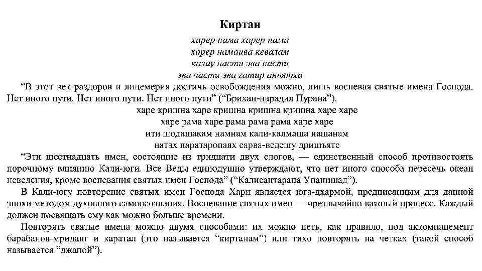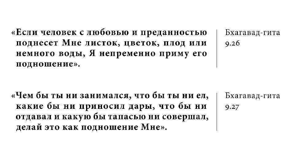 Домашнее задание по седьмому занятию: Задание 1. Поскольку следующее занятие последнее и после него сложно будет проверять что-то, это домашнее задание будет последним. Нужно написать эссе на тему «Что мне дал этот курс» . Не что «прослушали» или «приняли к сведению» , а что стало важным открытием, что вошло в мировоззрение, какой живой опыт появился. Не нужно слишком благодарить преподавателя (такая возможность у вас еще будет), не нужно каких-то совсем общих слов. . . Подумайте о том, что из пройденного затронуло вас, заставило по-другому смотреть на мир. При этом может быть удобно держать в голове (или перед глазами) примерную структуру того, что мы разбирали: 1. Знакомство, «вечные вопросы» . 2. Кто я? Описание души и ее свойств. Виды счастья. 3. Где я? Карма и реинкарнация, ахимса. 4. Гуны и проводники гун. 5. Предназначение материального мира. 6. Что делать? Принципы йоги. Карма-йога. Гьяна-йога. 7. Бхакти-йога, любовь, молитва, служение. 8. Выбор духовного пути. Это эссе – итог вашего обучения, важно его осмыслить, перевести на сознательный уровень и зафиксировать. 2. Продолжаем заполнять «дневник благости» , возможно, корректируя свои «обеты» с учетом новых знаний. Форма отчетности Минимальный объем не ставится (на случай, если вы совсем ничего не вынесли), но оптимально 2 -3 страницы текста, но можно больше. 3. Прочитать раздел «Бхакти-йога» (стр. 202 -228) и Приложения «Мантры» и «Молитвы» (стр. 273 -309). Файл с дневником высылается преподавателю не позже четверга. 4. Те, кто хочет, могут начать практиковать мантра-медитацию. 5. Если будет желание, можно приготовить к следующему занятию что-то вкусное, учитывая базовые правила чистоты: использовать только вегетарианские продукты, готовить в чистой одежде, с хорошим настроением, не пробовать блюда во время (и после) приготовления, желательно при этом слушать киртан.