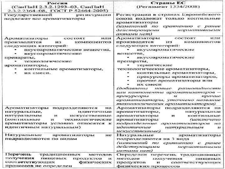 • Описание должно читаться следующим образом: «пищевой продукт или категория пищевого продукта или источник ароматизатора» . • Термин «натуральный пищевой продукт или категория пищевого продукта или источник ароматизатора с другими натуральными ароматизаторам» может использоваться для описания ароматизаторов только в том случае, если вкусоароматический компонент ароматизатора частично получен из названного источника, вкус и аромат которого легко узнаваем. • Термин «натуральный ароматизатор» может быть использован в том случае, если вкусоароматический компонент ароматизатора получен из других исходных материалов и когда ссылка на этот исходный материала не отражает его вкус и аромат. • Основные различия в регламентации ароматизаторов в России и странах ЕС • Основные отличия существующего российского и нового европейского законодательства в области ароматизаторов представлены в таблице.