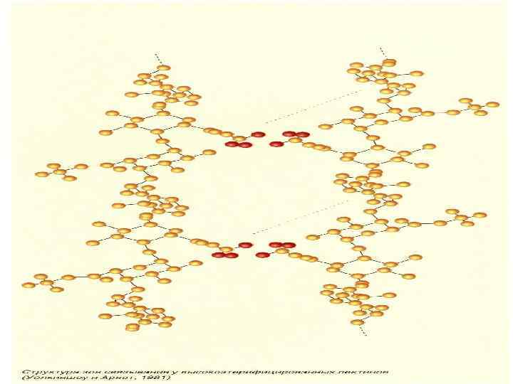 Сближение взаимодействия цепочек высокоэтирифированных пектинов описывается в соответствии с современными теориями образования гелей двумя механизмами: с одной стороны, метоксильные группы, которая образует гидрофобную составляющую пектинов стремятся сблизится друг с другом, образуя наименьшую поверхность контакта с водой. Метоксильные группы отвечают за первичное сближение пектиновых цепочек. Во второй стадии между свободными недиссоциированными карбоксильными группами образуются водородные мостики, которые могут удержать и стабилизировать комплексы, образовавшиеся в процессе сближения и взаимодействия метоксильных групп. Чем меньше количество диссоциированных карбоксильных групп, то есть чем ниже значение р. Н в системе, тем более благоприятными являются условия для образования водородных мостиков. Пектина с очень высокой степенью этерификации необходимо из за большего количества возможных точек связывания меньшего количества кислоты для того чтобы образовать и стабилизировать гелиевую структуру чем пектина с низкой степенью этирифакиции