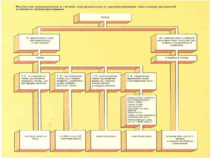 Синерезис в пектинах высокой этерификации: Желированные ВЭ – пектинами продукты содержат, как правило, не менее 60% сухого вещества. При таком высоком содержании CВ в продуктах, полученных в оптимальных условиях, синерезис не проявляется. Наиболее часто причиной синерезиса служат неблагоприятные условия производства, которые можно объединить понятием «преждевременное желирование» , которое происходит в тех случаях когда для геля выбрана слишком низкая температура розлива. Возможны следующие причины (при правильной дозировке пектина): • Слишком высокая концентрация сахара; • Слишком высокая дозировка кислоты (приводит к слишком низкому значению р. Н продукта); • Неподходящий тип пектина В таких случаях помогает корректировка концентрации сахара и кислоты а также приведение в соответствие температуры розлива и типа пектина.