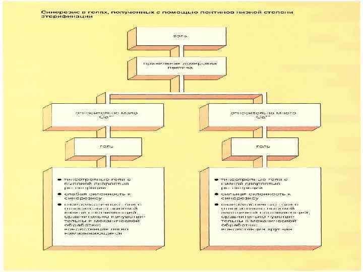 Пектины низкой этерификации Решающим фактором для появления синерезиса в гелях с пектинами низкой степени этерификации является выбираемая согласно рецептуре соотношение пектина и кальция. При правильной дозировке пектина и относительно малом содержании ионов кальция получают тиксотропные гели с высокой степенью регенерации, которые относительно мало склонны к синерезису. Повышение количества кальция по отношению к выбранной дозировке пектина повышает эластичность гелей, доля вязкой составляющей уменьшается текстура становится хрупкой, получается тиксотропные гели с низкой скоростью регенерации. Оптимальные дозировки пектина и кальция зависят от значени р. Н, ионной силы, вида и количества сахара и потому должны согласоваться с этими параметрами. Возникновение сильного синерезиса в мармеладе выглядит неаппетитно и на этом основании он рассматривается изготовителями и потребителями мармелада как недостаток качества которого следует избегать.