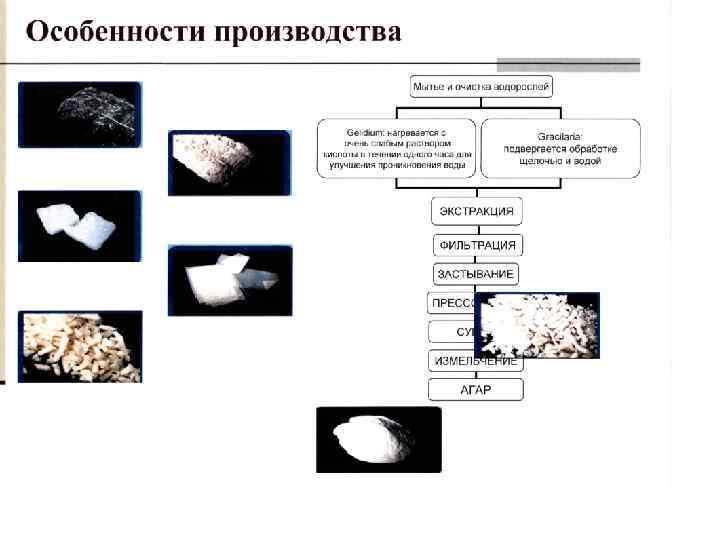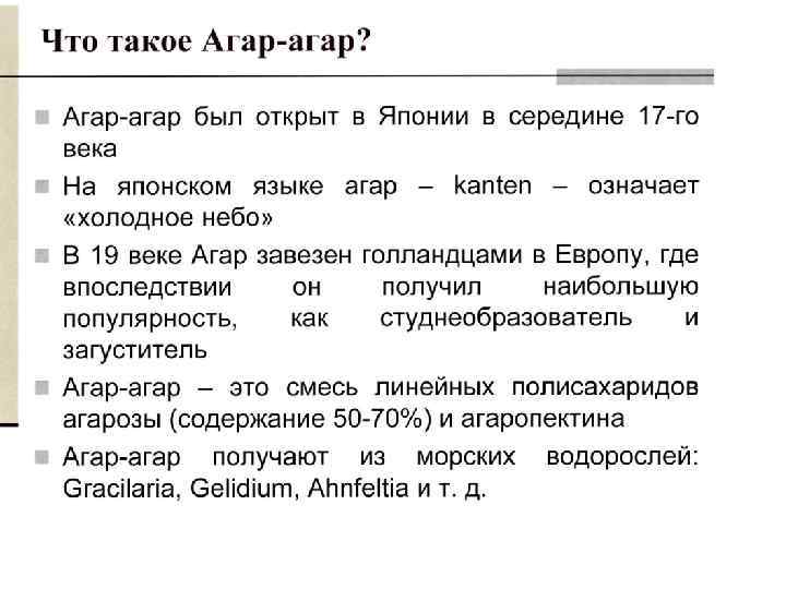 q. Агар представляет собой смесь полисахаридов агарозы и агаропектина, в основе которых лежит галактоза. q. Agarose, (агароза, около 70%), сильно желирующий, не иодированный линейный полисахарид, построенный из строго чередующихся остатков 1, 3 -замещенной- p-Dгалактопиранозы и 1, 4 -замещенной 3, 6 -ангидро- а -L-галактопиранозы, q. Agaropectin, (агаропектин), комплексный полисахарид, включающий группу сульфатов. В молекулах агаропектина часть остатков 3, 6 ангидро- L- галактозы заменена остатками 6 сульфата L-галактозы. q. Его получают путем длительного вываривания в горячей воде с добавлением щелочи. После фильтрации и охлаждения, образующийся студень режут на бруски и сушат до влажности не более 18 %.