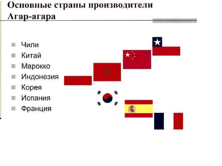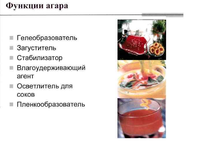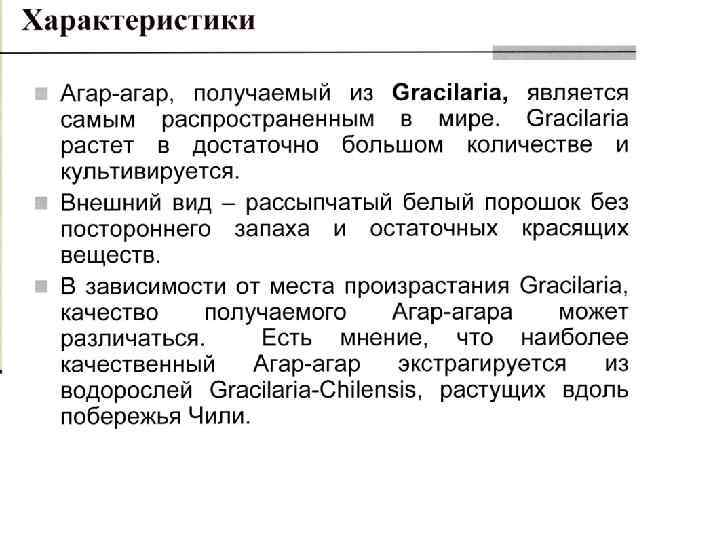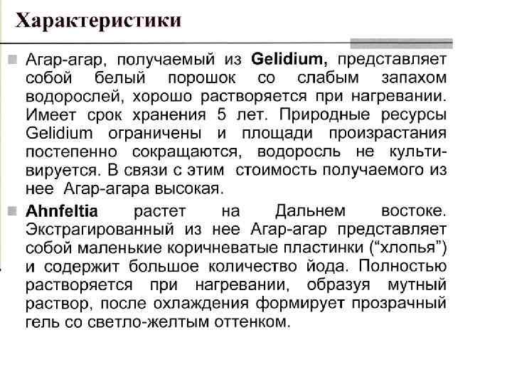 q. Gelagar – полностью разработанная система агара, полученная из специально отобранных морских водорослей gelidium, gracilaria and pterocladia различного происхождения. q. Gelagar – продукт, созданный для использования в кондитерской промышленности и для производства джемов. q. Gelagar – представляет собой различные виды агара с уникальными свойственными характеристиками: • Цвет – белый или с кремовым оттенком • Запах, вкус - отсутствуют • Влажность – 10 -15% • Зольность – менее 3 % • р. Н – 6, 8 -7, 2 • Растворимость - высокая • Прочность геля – 500 – 1000 г/см 3 • Температура желирования – 35 -43 С 0 • Температура плавления – 85 -95 С 0