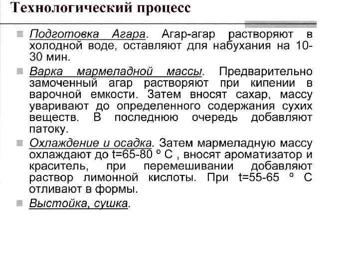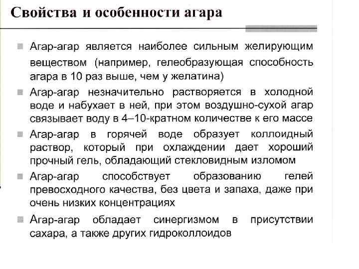 Агар (Е 406) – природное желирующее вещество, извлекаемое из красных морских водорослей генера гелидиум (genera Gelidium), грацилария (Gracilaria) и их разновидностей, которые найдены в прибрежных водах Кореи, Японии, Чили, Испании, Португалии и Марокко. Агар представляет собой смесь полисахаридов агарозы и агаропектина, в основе которых лежит галактоза. Его получают путем длительного вываривания в горячей воде с добавлением щелочи. После фильтрации и охлаждения, образующийся студень режут на бруски и сушат до влажности не более 18 %. Агар незначительно растворяется в холодной воде, но растворяется в кипящей, образуя раствор, который при охлаждении дает прочный студень со стекловидным изломом. По качеству агар подразделяется на два сорта: высший и первый. Стандартом регламентируются прочность студня (300 г при 20 ºС), температура застывания (для раствора агара, содержащего 0, 85 % сухого агара, не ниже 30 ºС) и температура плавления (для студня, содержащего 0, 85 % сухого агара – не ниже 80 ºС).