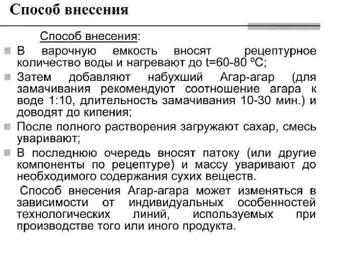 q Стандартом регламентируются прочность студня (300 г при 20 ºС), температура застывания (для раствора агара, содержащего 0, 85 % сухого агара, не ниже 30 ºС) и температура плавления (для студня, содержащего 0, 85 % сухого агара – не ниже 80 ºС). Стандартная маркировка импортного агара включает: q Название фирмы-производителя q Страну производства продукта q Название продукта q Е-код, при необходимости q Вес нетто q Вес брутто q № партии q Срок использования