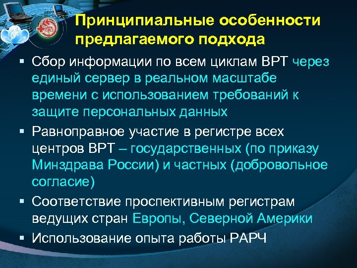 Принципиальные особенности предлагаемого подхода § Сбор информации по всем циклам ВРТ через единый сервер в реальном масштабе времени с использованием требований к защите персональных данных § Равноправное участие в регистре всех центров ВРТ – государственных (по приказу Минздрава России) и частных (добровольное согласие) § Соответствие проспективным регистрам ведущих стран Европы, Северной Америки § Использование опыта работы РАРЧ