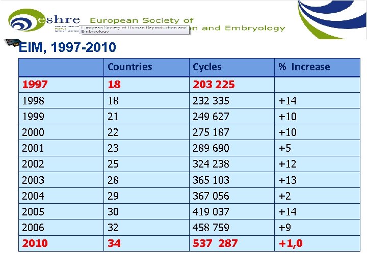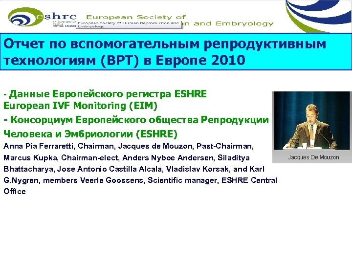 Отчет по вспомогательным репродуктивным технологиям (ВРТ) в Европе 2010 - Данные Европейского регистра ESHRE European IVF Monitoring (EIM) - Консорциум Европейского общества Репродукции Человека и Эмбриологии (ESHRE) Anna Pia Ferraretti, Chairman, Jacques de Mouzon, Past-Chairman, Marcus Kupka, Chairman-elect, Anders Nyboe Andersen, Siladitya Bhattacharya, Jose Antonio Castilla Alcala, Vladislav Korsak, and Karl G. Nygren, members Veerle Goossens, Scientific manager, ESHRE Central Office