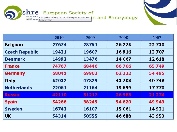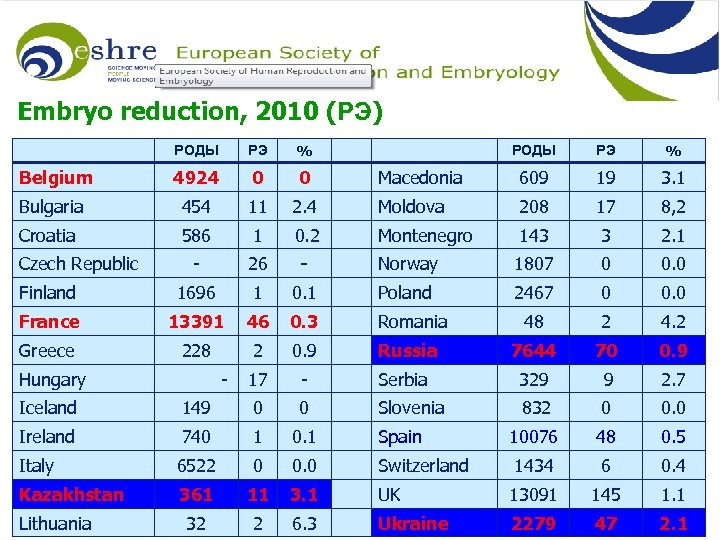 Embryo reduction, 2010 (РЭ) РОДЫ РЭ % 4924 0 0 Macedonia 609 19 3. 1 Bulgaria 454 11 2. 4 Moldova 208 17 8, 2 Croatia 586 1 0. 2 Montenegro 143 3 2. 1 - 26 - Norway 1807 0 0. 0 Finland 1696 1 0. 1 Poland 2467 0 0. 0 France 13391 46 0. 3 Romania 48 2 4. 2 228 2 0. 9 Russia 7644 70 0. 9 Hungary - 17 - Serbia 329 9 2. 7 Iceland 149 0 0 Slovenia 832 0 0. 0 Ireland 740 1 0. 1 Spain 10076 48 0. 5 Italy 6522 0 0. 0 Switzerland 1434 6 0. 4 Kazakhstan 361 11 3. 1 UK 13091 145 1. 1 32 2 6. 3 Ukraine 2279 47 2. 1 Belgium Czech Republic Greece Lithuania