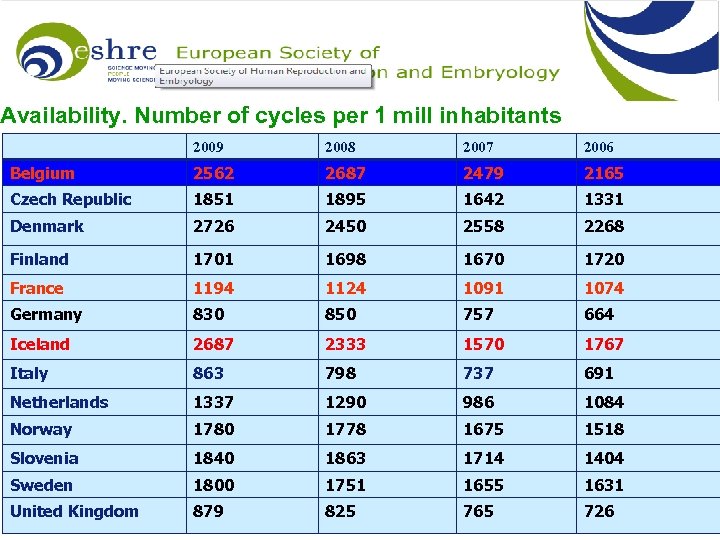 Delivery rate per aspiration IVF-2010 Cyprus 47. 9 Slovenia 26. 3 Belgium 19. 6 Montenegro 45. 8 Portugal 24. 5 France 18. 9 Moldova 34. 9 Lithuania 24. 6 Switzerland 17. 8 Macedonia 31. 2 Sweden 24. 6 Denmark 17. 7 Bulgaria 30. 4 Norway 24. 1 Serbia 17. 3 Ukraine 30. 0 Ireland 22. 8 Italy 15. 6 Serbia 28. 4 Finland 21. 7 Iceland 14. 5 Greece 26. 7 Netherlands 20. 5 Croatia 14. 5 UK 26. 5 Russia 20. 4 Germany 13. 4 Kazakhstan 26. 5 Spain 20. 0 Romania 4. 3