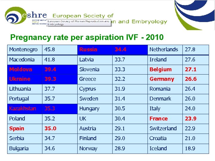 Pregnancy rate per aspiration IVF - 2010 Montenegro 45. 8 Russia 34. 4 Netherlands 27. 8 Macedonia 41. 8 Latvia 33. 7 Ireland 27. 6 Moldova 39. 4 Slovenia 33. 3 Belgium 27. 1 Ukraine 39. 3 Greece 32. 2 Germany 26. 6 Lithuania 37. 7 Cyprus 31. 9 Romania 26. 4 Portugal 35. 7 Sweden 31. 4 Denmark 26. 0 Kazakhstan 35. 3 Hungary 30. 5 Italy 24. 0 Poland 35. 2 UK 30. 4 France 23. 9 Spain 35. 0 Austria 29. 1 Switzerland 22. 9 Serbia 34. 7 Finland 29. 0 Croatia 21. 0 Bulgaria 34. 6 Norway 28. 9 Iceland 18. 9