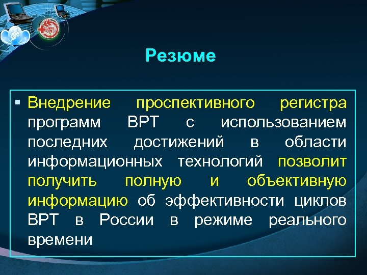 Резюме § Внедрение проспективного регистра программ ВРТ с использованием последних достижений в области информационных технологий позволит получить полную и объективную информацию об эффективности циклов ВРТ в России в режиме реального времени