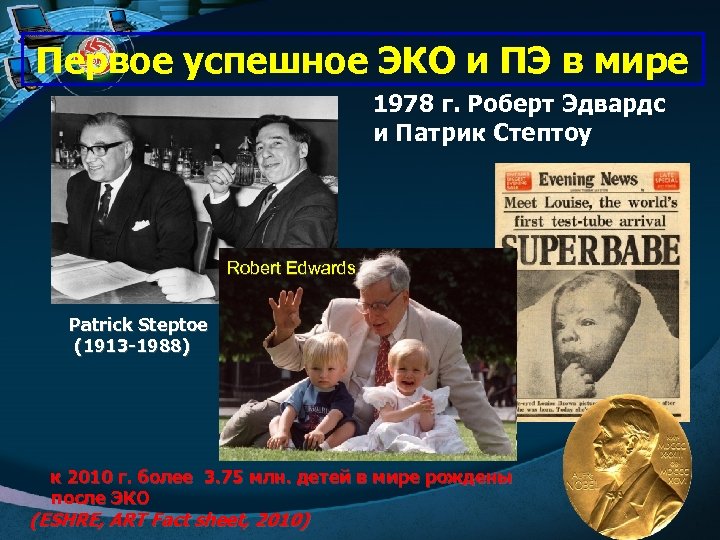 Первое успешное ЭКО и ПЭ в мире 1978 г. Роберт Эдвардс и Патрик Стептоу Robert Edwards Patrick Steptoe (1913 -1988) к 2010 г. более 3. 75 млн. детей в мире рождены после ЭКО (ESHRE, ART Fact sheet, 2010)