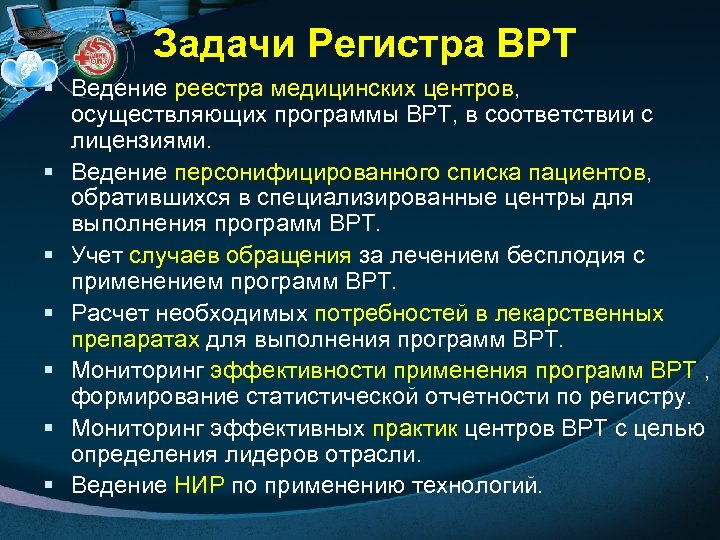 Задачи Регистра ВРТ § Ведение реестра медицинских центров, осуществляющих программы ВРТ, в соответствии с лицензиями. § Ведение персонифицированного списка пациентов, обратившихся в специализированные центры для выполнения программ ВРТ. § Учет случаев обращения за лечением бесплодия с применением программ ВРТ. § Расчет необходимых потребностей в лекарственных препаратах для выполнения программ ВРТ. § Мониторинг эффективности применения программ ВРТ , формирование статистической отчетности по регистру. § Мониторинг эффективных практик центров ВРТ с целью определения лидеров отрасли. § Ведение НИР по применению технологий.