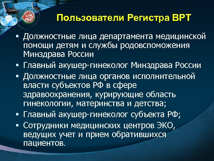 Пользователи Регистра ВРТ § Должностные лица департамента медицинской помощи детям и службы родовспоможения Минздрава России § Главный акушер-гинеколог Минздрава России § Должностные лица органов исполнительной власти субъектов РФ в сфере здравоохранения, курирующие область гинекологии, материнства и детства; § Главный акушер-гинеколог субъекта РФ; § Сотрудники медицинских центров ЭКО, ведущих учет и прием обратившихся пациентов.
