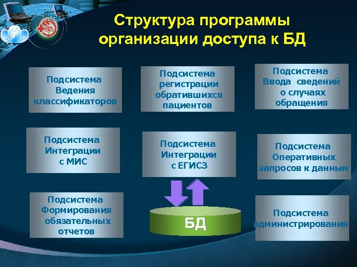 Структура программы организации доступа к БД Подсистема Ведения классификаторов Подсистема Интеграции с МИС Подсистема Формирования обязательных отчетов Подсистема регистрации обратившихся пациентов Подсистема Ввода сведений о случаях обращения Подсистема Интеграции с ЕГИСЗ Подсистема Оперативных запросов к данным БД Подсистема администрирования