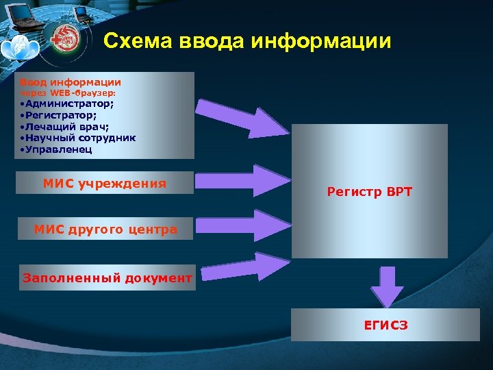 Схема ввода информации Ввод информации через WEB-браузер: • Администратор; • Регистратор; • Лечащий врач; • Научный сотрудник • Управленец МИС учреждения Регистр ВРТ МИС другого центра Заполненный документ ЕГИСЗ