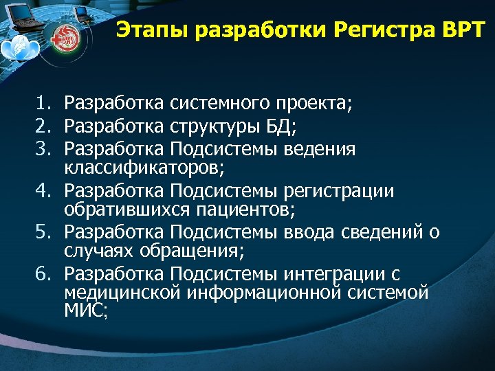 Этапы разработки Регистра ВРТ 1. Разработка системного проекта; 2. Разработка структуры БД; 3. Разработка Подсистемы ведения классификаторов; 4. Разработка Подсистемы регистрации обратившихся пациентов; 5. Разработка Подсистемы ввода сведений о случаях обращения; 6. Разработка Подсистемы интеграции с медицинской информационной системой МИС;