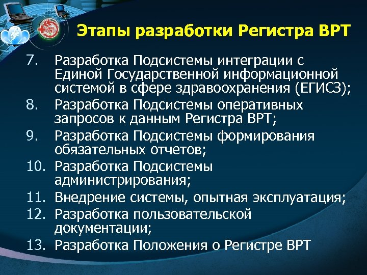 Этапы разработки Регистра ВРТ 7. 8. 9. 10. 11. 12. 13. Разработка Подсистемы интеграции с Единой Государственной информационной системой в сфере здравоохранения (ЕГИСЗ); Разработка Подсистемы оперативных запросов к данным Регистра ВРТ; Разработка Подсистемы формирования обязательных отчетов; Разработка Подсистемы администрирования; Внедрение системы, опытная эксплуатация; Разработка пользовательской документации; Разработка Положения о Регистре ВРТ