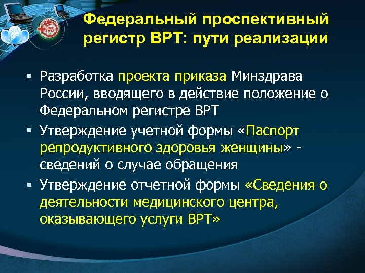 Федеральный проспективный регистр ВРТ: пути реализации § Разработка проекта приказа Минздрава России, вводящего в действие положение о Федеральном регистре ВРТ § Утверждение учетной формы «Паспорт репродуктивного здоровья женщины» - сведений о случае обращения § Утверждение отчетной формы «Сведения о деятельности медицинского центра, оказывающего услуги ВРТ»