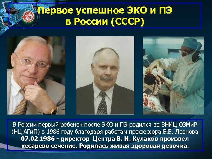 Первое успешное ЭКО и ПЭ в России (СССР) В России первый ребенок после ЭКО и ПЭ родился во ВНИЦ ОЗМи. Р (НЦ АГи. П) в 1986 году благодаря работам профессора Б. В. Леонова (НЦ АГи. П) в 1986 году 07. 02. 1986 - директор Центра В. И. Кулаков произвел кесарево сечение. Родилась живая здоровая девочка.