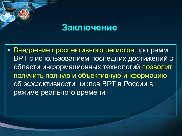 Заключение § Внедрение проспективного регистра программ ВРТ с использованием последних достижений в области информационных технологий позволит получить полную и объективную информацию об эффективности циклов ВРТ в России в режиме реального времени