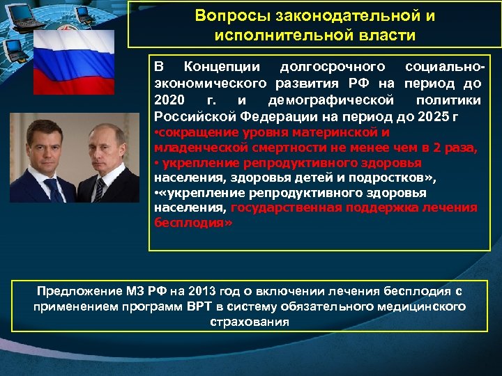 Вопросы законодательной и исполнительной власти В Концепции долгосрочного социальноэкономического развития РФ на период до 2020 г. и демографической политики Российской Федерации на период до 2025 г • сокращение уровня материнской и младенческой смертности не менее чем в 2 раза, • укрепление репродуктивного здоровья населения, здоровья детей и подростков» , • «укрепление репродуктивного здоровья населения, государственная поддержка лечения бесплодия» Предложение МЗ РФ на 2013 год о включении лечения бесплодия с применением программ ВРТ в систему обязательного медицинского страхования