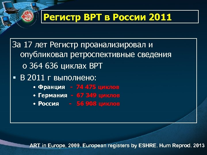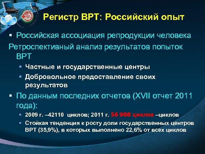 Регистр ВРТ: Российский опыт § Российская ассоциация репродукции человека Ретроспективный анализ результатов попыток ВРТ § Частные и государственные центры § Добровольное предоставление своих результатов § По данным последних отчетов (XVII отчет 2011 года): § 2009 г. – 42110 циклов; 2011 г. 56 908 циклов –циклов § Стойкая тенденция к росту доли государственных центров ВРТ (35, 9%), в которых выполнено 22, 6% от всех циклов