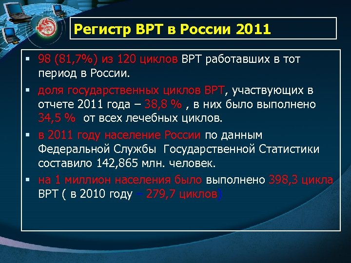 Регистр ВРТ в России 2011 § 98 (81, 7%) из 120 циклов ВРТ работавших в тот период в России. § доля государственных циклов ВРТ, участвующих в отчете 2011 года – 38, 8 % , в них было выполнено 34, 5 % от всех лечебных циклов. § в 2011 году население России по данным Федеральной Службы Государственной Статистики составило 142, 865 млн. человек. § на 1 миллион населения было выполнено 398, 3 цикла ВРТ ( в 2010 году – 279, 7 циклов)