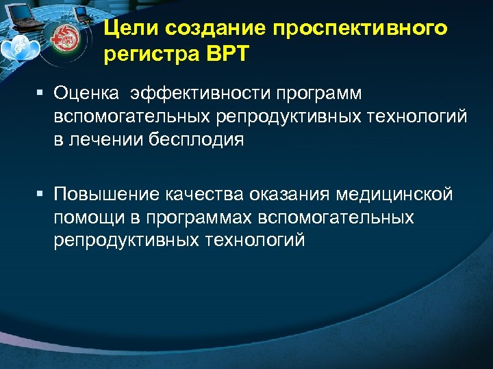 Цели создание проспективного регистра ВРТ § Оценка эффективности программ вспомогательных репродуктивных технологий в лечении бесплодия § Повышение качества оказания медицинской помощи в программах вспомогательных репродуктивных технологий