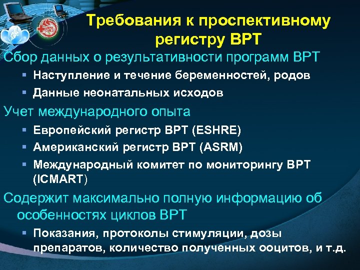 Требования к проспективному регистру ВРТ Сбор данных о результативности программ ВРТ § Наступление и течение беременностей, родов § Данные неонатальных исходов Учет международного опыта § Европейский регистр ВРТ (ESHRE) § Американский регистр ВРТ (ASRM) § Международный комитет по мониторингу ВРТ (ICMART) Содержит максимально полную информацию об особенностях циклов ВРТ § Показания, протоколы стимуляции, дозы препаратов, количество полученных ооцитов, и т. д.
