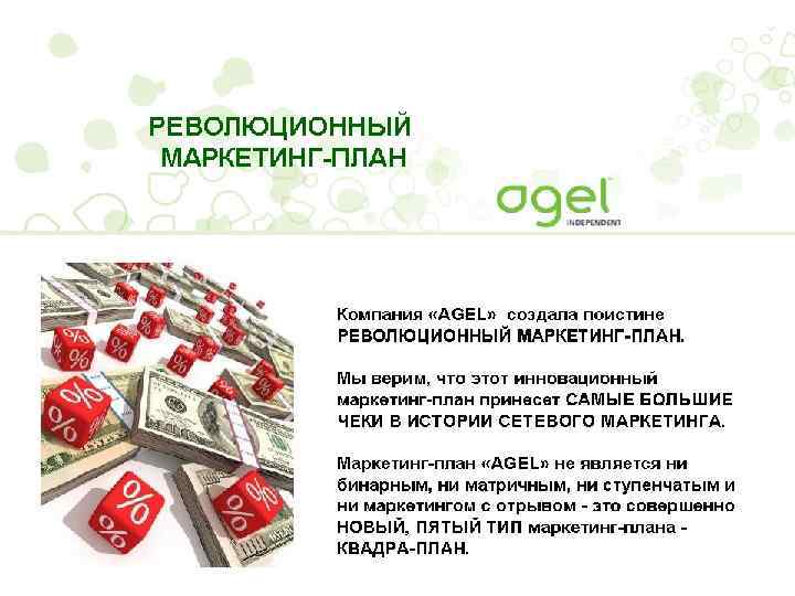 AGEL – ЭТО ВАШ ШАНС СОЗДАТЬ ПОСТОЯННО РАСТУЩИЙ ДОХОД Расчет маркетинг-плана по 4 человека на первой линии 1. 4 x (35%x 75000$) = 105 000$ 2. 16 x (7%x 75000$) = 84 000 $ 3. 64 x (7% x 75 000$) = 336 000 $ 4. 256 x (7 % x 75000$) = 1344000$ Итого по кумулятивному бонусу — 1 869 000$ Групповой бонус (10%) = 75000$ Автомобильный бонус = 1000$ Бонус развития бизнеса = 1000$ Итого ежемесячно - 1 946 000 $