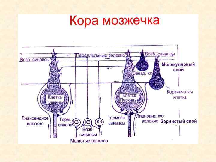 . Схема межнейронных связей в коре мозжечка. 1 – лазящие волокна, идущие к коре мозжечка от спинного мозга и вестибулярных ядер ствола. 2 – клетка Пуркинье, образующая плоское дендритное дерево. 3 – аксоны клеток Пуркинье направляются к ядрам мозжечка. 4 – моховидные волокна идут от ядер олив и ядер моста и оканчиваются на дендритах клеток зерен (5). Эти контакты образуют синаптические гломерулы.