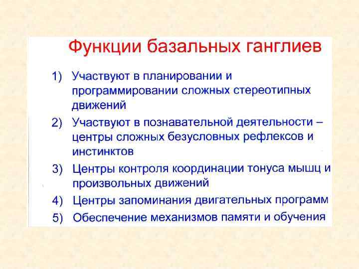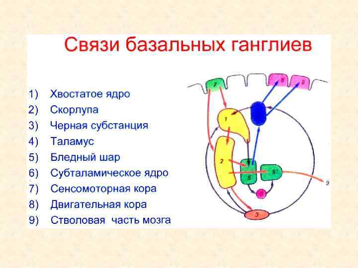 Базальные ядра: хвостатое ядро полосатое чечевице скорлупа тело подобное тело бледный шар