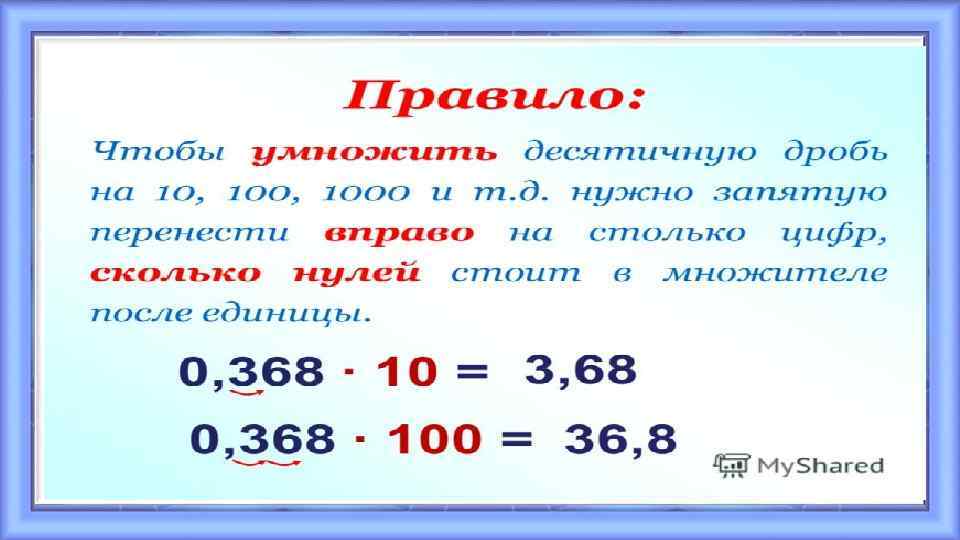Правило Чтобы умножить десятичную дробь на натуральное число, надо: 1). Умножить дробь на число, не обращая внимание на запятую 2). В полученном произведении отделить запятой столько цифр справа, сколько их после запятой в дроби.