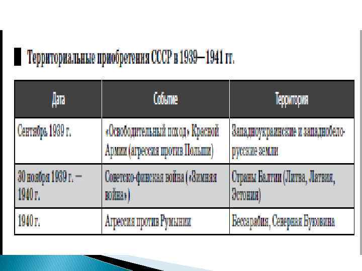 Начало II МВ: хроника событий 7) 28 сентября 1939 – подписан Пакт о взаимопомощи СССР – Эстония; ввод советских войск. 8) 5 октября 1939 – подписан Пакт о взаимопомощи СССР – Латвия; ввод советских войск. 9) 30 ноября 1939 - 12 марта 1940 - нападение СССР на Финляндию, т. к. Финляндия отказалась подписать Пакт о взаимопомощи. «Зимняя война» . 10) 14 декабря 1939 - Исключение СССР из Лиги наций из-за агрессии. 11) 12 марта 1940 – подписан Мирный договор между СССР и Финляндией. К СССР присоединены Карельский перешеек с г. Выборг и земли в районе Куолаярви; на 30 лет предоставлен в аренду полуостров Ханко (Гангут).